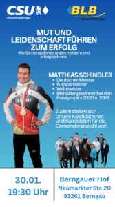 Am 30.01.2026 kommt der erfolgreiche Para-Radsportler Matthias Schindler in den Berngauer Hof. In seinem Vortrag zum Thema „Mut und Leidenschaft führen zum Erfolg“ berichtet er aus seinem sportlichen und persönlichen Werdegang.