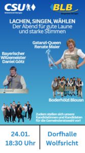 Freuen Sie sich auf einen unterhaltsamen bayerischen Abend mit Humor, Musik und Geselligkeit. Unter dem Motto „Lachen, Singen, Wählen“ erwartet Sie ein abwechslungsreiches Programm mit bekannten und beliebten Akteuren: